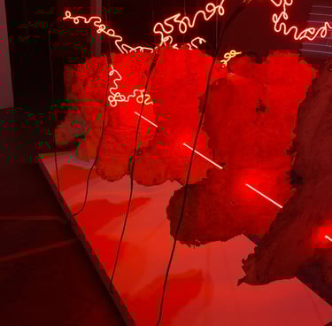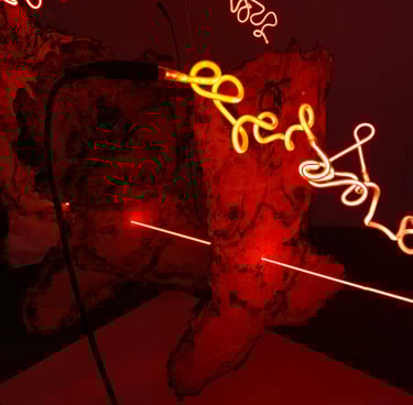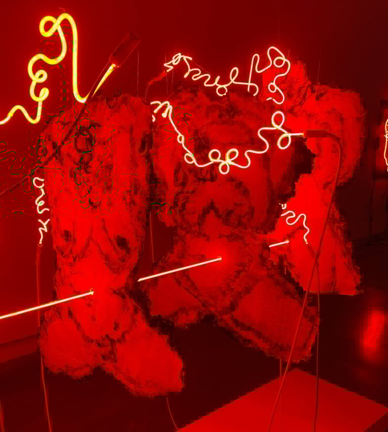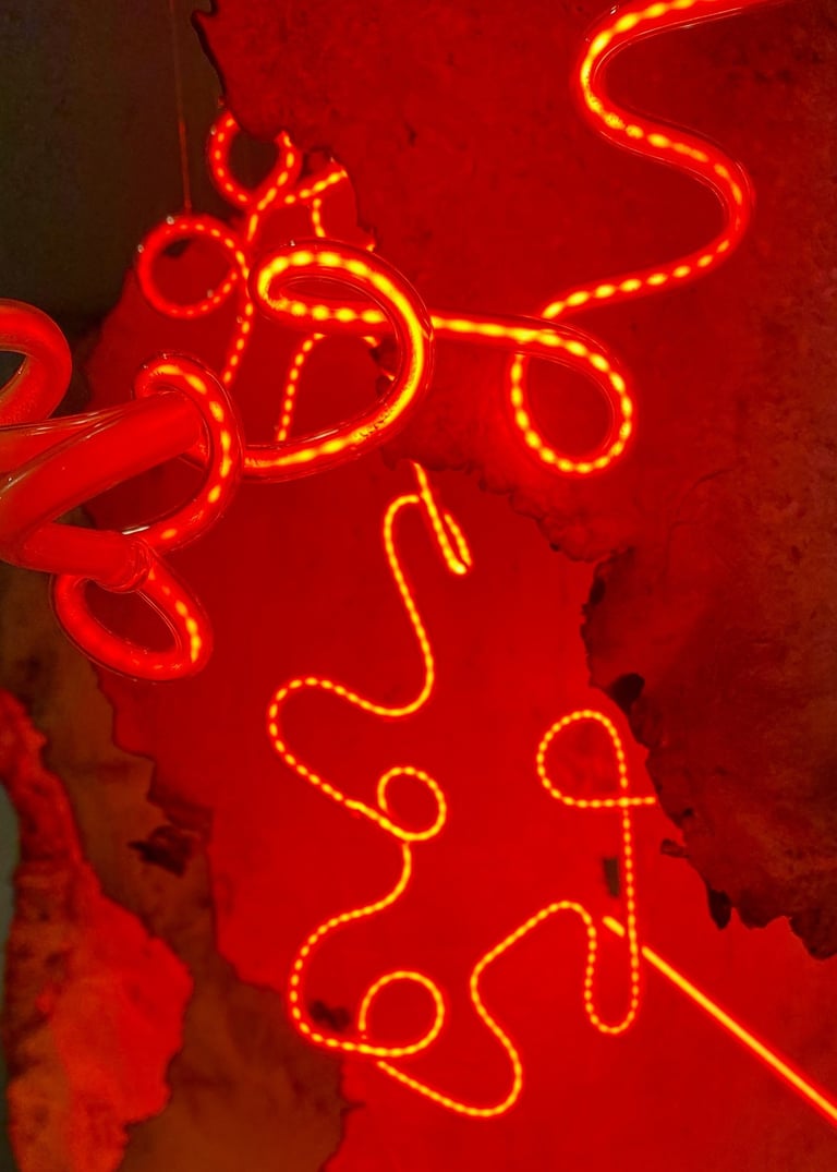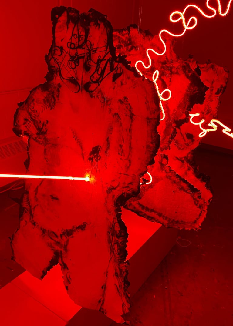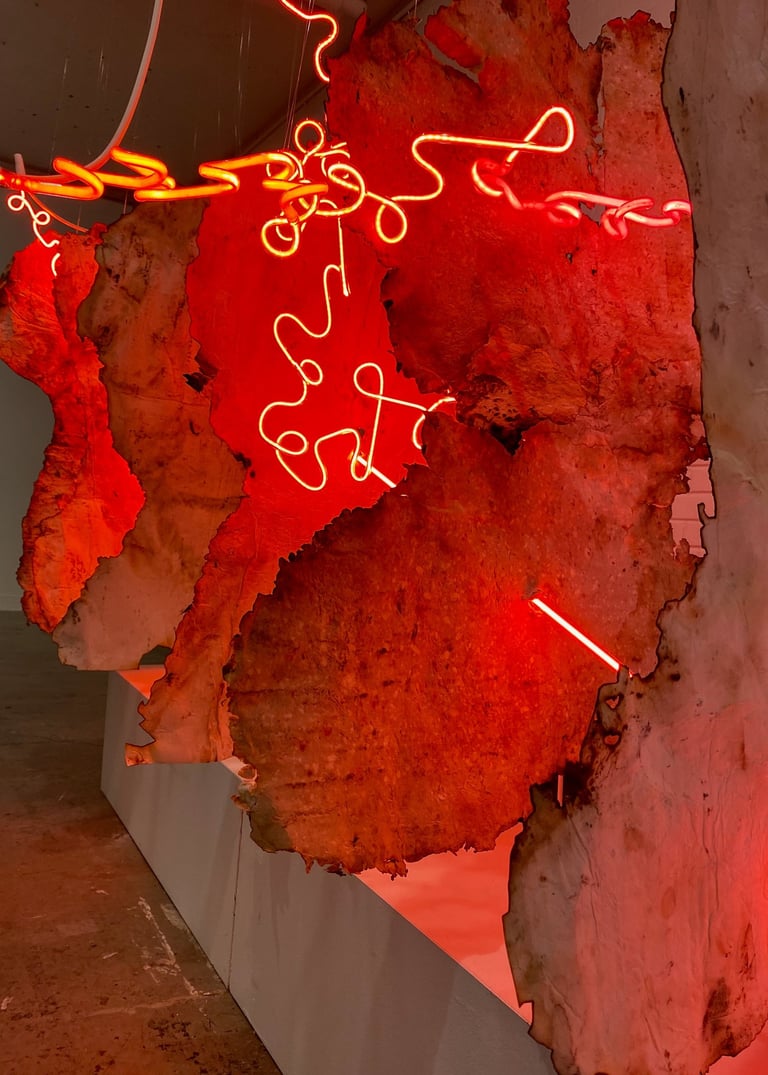 Neon, cotton paper burned through dripping and rolling hot glass, pedestal 10ft x 3ft x 7ft