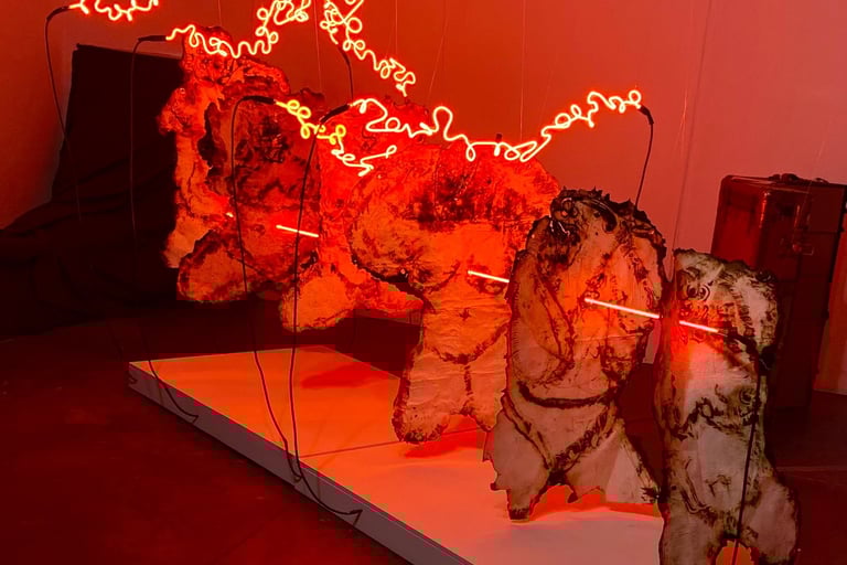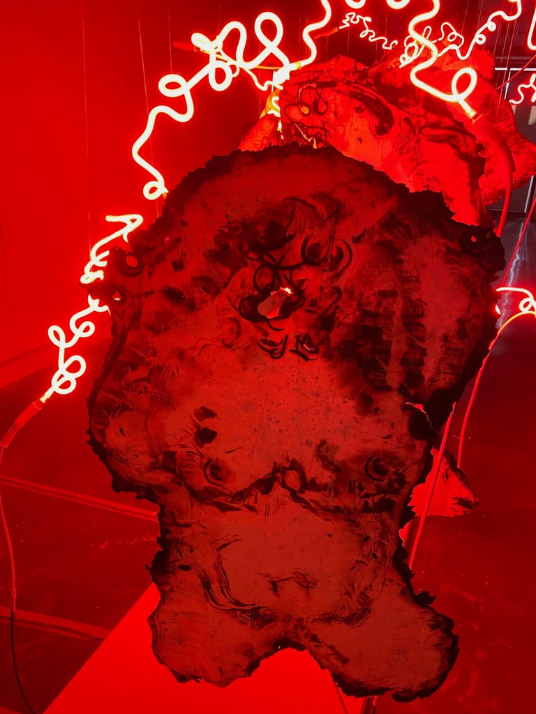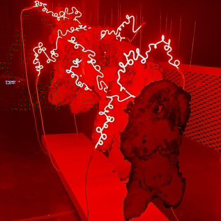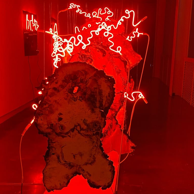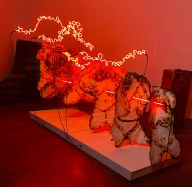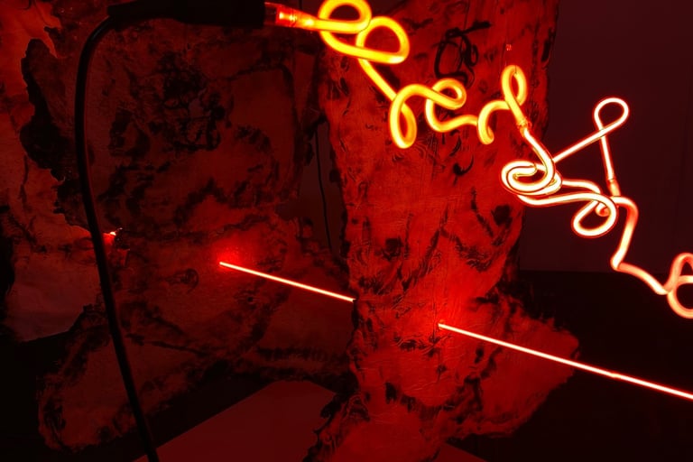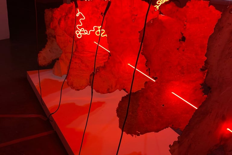 Neon, cotton paper burned through dripping and rolling hot glass, pedestal 10ft x 3ft x 7ft
